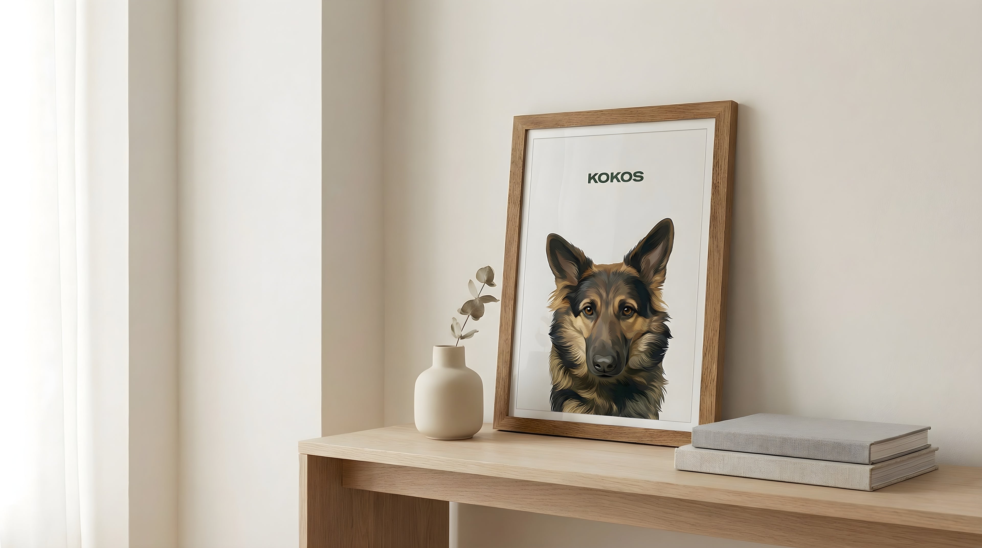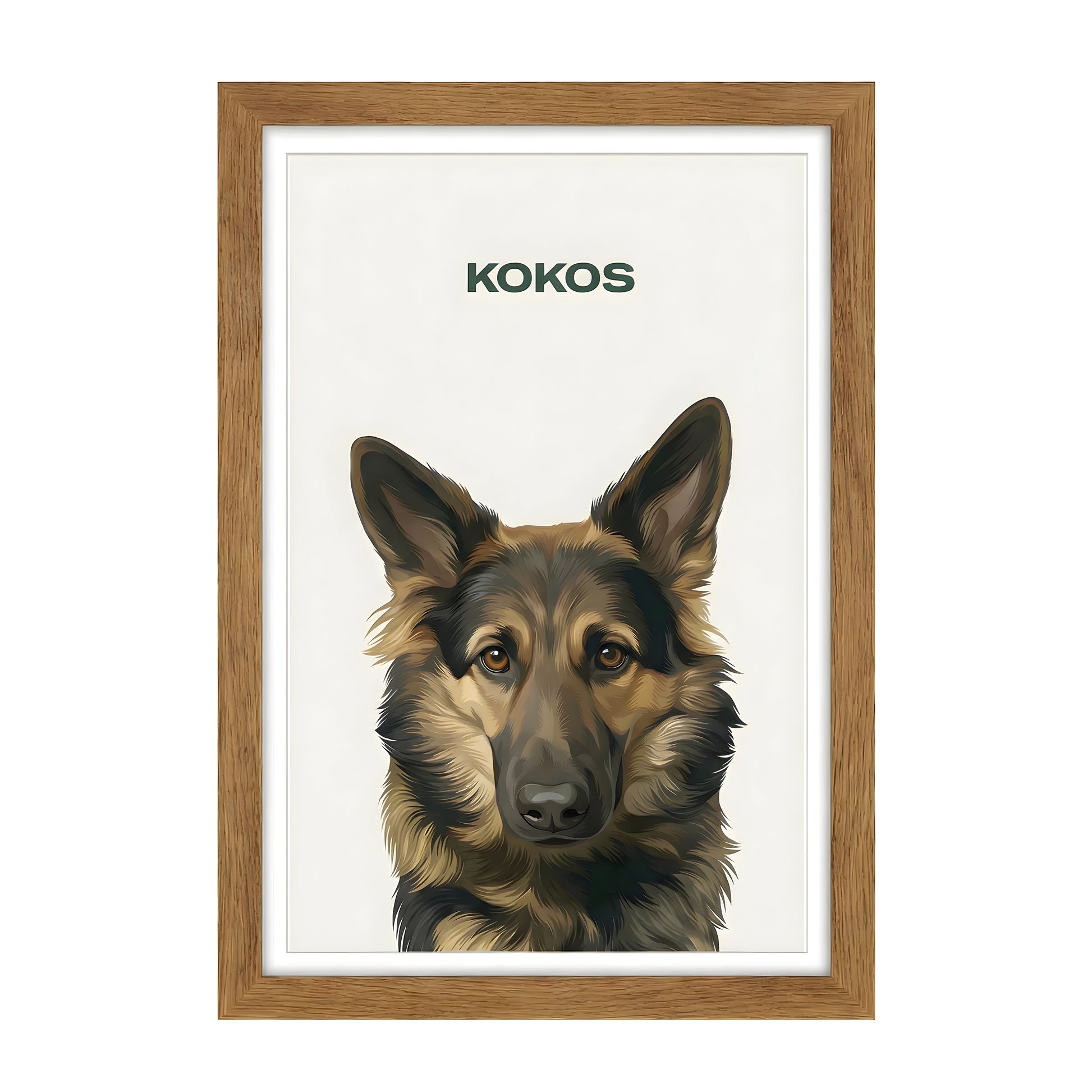 Minimalistyczny projekt w eleganckiej drewnianej ramce to wyjątkowy sposób, by codziennie cieszyć oczy portretem Twojego ukochanego pupila.